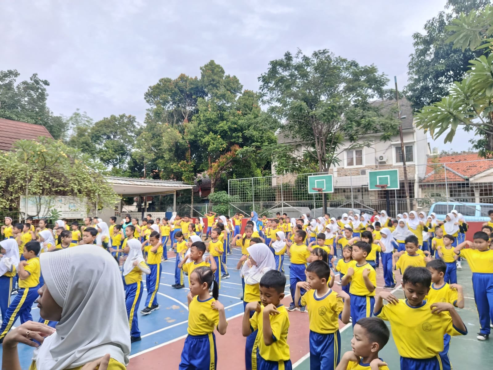 Dipandu oleh guru di bagian depan lapangan, anak-anak berbaris rapi mengikuti setiap gerakan. Mulai dari pemanasan, peregangan, hingga gerakan inti, semuanya dilakukan dengan penuh semangat. Ada yang serius menghitung gerakan, ada juga yang sesekali tersenyum dan bercanda kecil dengan temannya, tapi tetap kompak mengikuti irama.