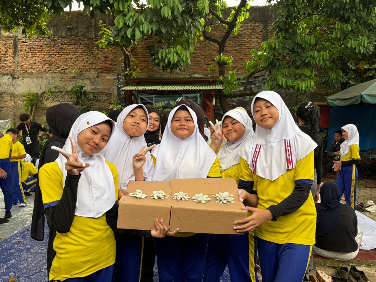 Keceriaan semakin terasa saat kegiatan memasuki sesi praktik pembuatan kerajinan clay. Dalam salah satu momen, beberapa siswa perempuan dengan bangga menunjukkan hasil karya mereka—sebuah bentuk kerajinan sederhana namun penuh kreativitas. Dengan senyum ceria, mereka memamerkan hasil karya yang disusun rapi di atas papan. Ekspresi bangga dan bahagia begitu terpancar, bahkan salah satu siswa dengan riang mengacungkan tanda damai, menambah kesan hangat dan menyenangkan dari kegiatan tersebut.