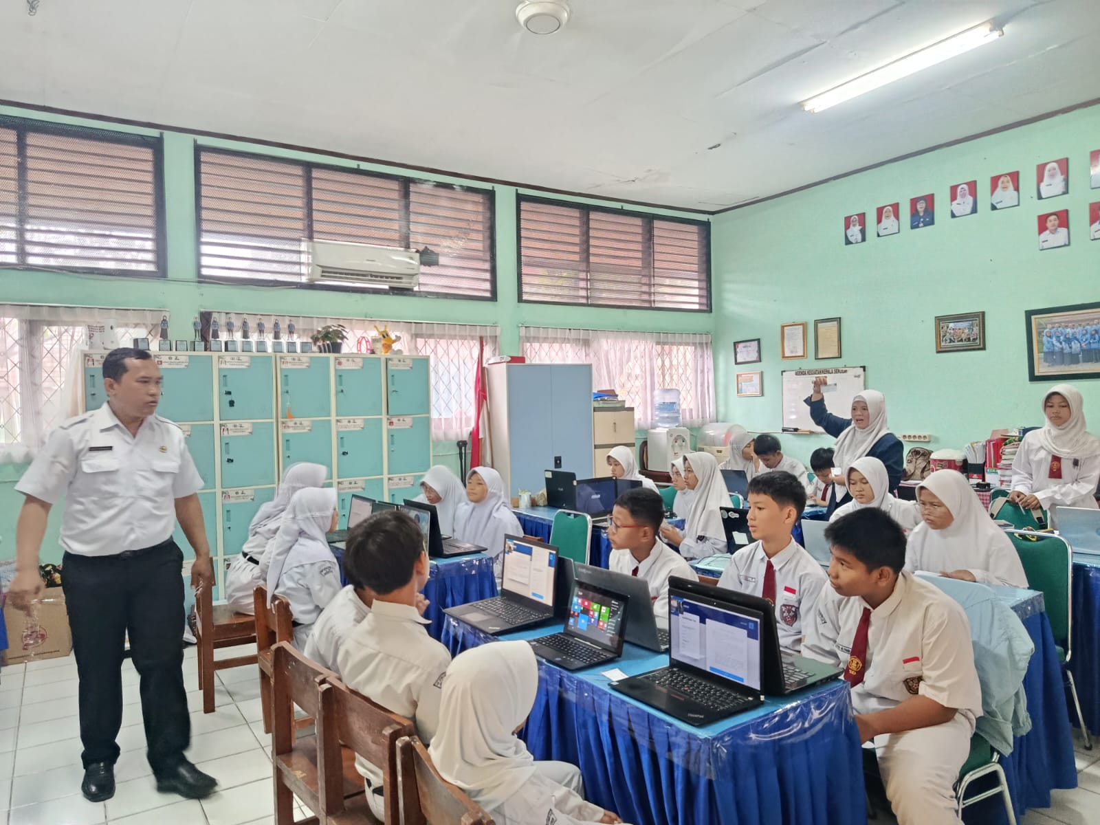 Dalam pelaksanaannya, guru dan tenaga kependidikan mendampingi secara aktif. Terlihat guru berkeliling memastikan seluruh perangkat berfungsi dengan baik serta membantu murid yang mengalami kendala teknis. Suasana ruangan tetap kondusif meskipun menggunakan perangkat digital, mencerminkan kesiapan sekolah dalam menyelenggarakan ujian berbasis teknologi.